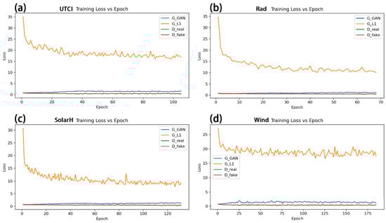 Training losses versus epoch for the four pix2pix models. (a) UTCI; (b) Rad; (c) SolarH; (d) Wind. Each subplot shows the generator adversarial loss (G_GAN), generator reconstruction loss (G_L1), and discriminator losses on real and fake pairs over the training epochs.