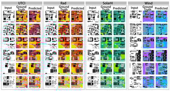 Overall, the model reconstructs continuous fields across all four tasks while preserving key spatial semantics, particularly the strength–weakness banding along street orientations, open spaces, and occlusion belts. The three columns show input form–ground truth–prediction; the predicted maps align with the ground truth in large-scale gradients and in building-shadow/sunshine striping, indicating that end-to-end learning has captured the dominant “form-to-performance” relationship (Figure 8). Structural reconstruction is most stable for radiation (Rad) and sunshine duration (SolarH), followed by thermal comfort (UTCI), whereas the wind field (Wind) is relatively weaker. In the Rad/SolarH panels, the high–low patterns at building projections, street corridors, and courtyard openings align well with the ground truth, with only slight smoothing in a few narrow alleys; the strong–weak partitioning in UTCI is broadly correct, though mild over-smoothing appears near boundaries. Wind reproduces the outlines of dominant corridors and recirculation zones, but it misses details and introduces artefacts at corners, narrow passages, and local backflows. These areas are typically associated with turbulence, flow separation, and small recirculation cells, which adversarial models find difficult to reconstruct from a single morphology channel. Typical errors concentrate in narrow gaps and sharp edges, manifesting as edge distortion, local over-smoothing, or small artefacts. These observations accord with the subsequent analyses of the edge overlap ratio (EOR) and hot/cold-region overlap, suggesting that stronger edge/gradient constraints or multi-scale feature alignment in adversarial training may further improve structural fidelity.