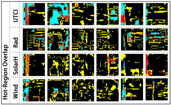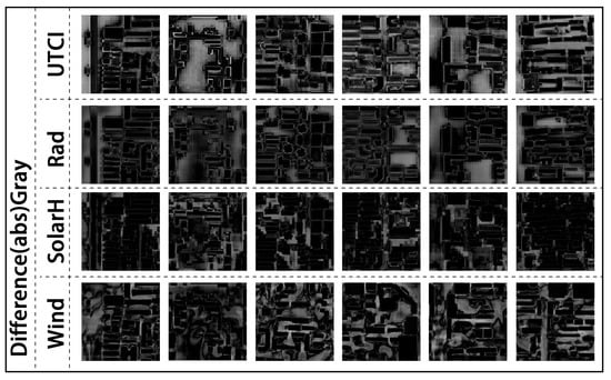 The absolute error maps reveal the visual error distribution and its structural correlation across the four tasks: Rad and SolarH exhibit the smallest errors, UTCI is intermediate, and Wind is comparatively larger. Each map encodes per-pixel absolute differences in grayscale—black denotes low error and white denotes high error; rows correspond to tasks and columns to different samples, enabling side-by-side comparisons (Figure 9). For Rad/SolarH, the background is generally dark, with only thin bright bands along building edges and narrow alleys, indicating the good reconstruction of large-scale gradients and occlusion striping, with errors concentrated near geometric discontinuities. UTCI shows a moderate error intensity, with a slight diffusion around boundaries, suggesting that banding in the thermal comfort field is captured, yet boundary over-smoothing remains the primary issue. Wind exhibits a mottled error pattern that spreads along corners, ventilation corridors, and local recirculation zones. This behaviour is consistent with the wind field’s high nonstationarity and local turbulence, and it implies that pixel consistency constraints alone are insufficient to capture fine-scale details in zones of flow separation and aerodynamic instability. Overall, the absolute error maps corroborate the structural reconstruction findings: Rad/SolarH achieve a higher visual quality, UTCI is usable but boundary-smooth, and Wind shows pronounced errors in complex flow regions. These observations provide an intuitive support for subsequent structural consistency metrics, including the edge overlap ratio (EOR) and hot/cold-region IoU.