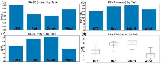Overall accuracy comparison by task. (a) RMSE, (b) PSNR, and (c) SSIM. Bars show the median values computed over the test set. (d) SSIM distribution across test samples shown as boxplots, where the central line indicates the median, the box denotes the interquartile range, whiskers represent the data range excluding outliers, circles denote outliers, and the triangle marker indicates the mean value. The dispersion ranges illustrate variability across the test set and serve as an approximate confidence interval for interpreting model stability.