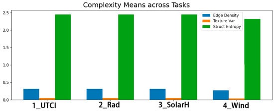 To investigate whether tasks share learnable patterns, cross-task synergy maps are constructed by intersecting correctly predicted hot (or cold) regions across pairs of targets and computing their IoU. High synergy indicates that similar morphological cues support multiple targets, whereas low synergy highlights conflicts or decoupling, as in the case of wind. In parallel, learnability is assessed by relating prediction errors to the semantic complexity of the input morphology. For each block, texture variance, edge density, and entropy are computed on the morphology raster and then correlated with RMSE at the block level, with R2 values reported. A high R2 between texture variance and RMSE for radiation tasks suggests that complex patterns are harder to learn, whereas a very low R2 for wind indicates that turbulence-related variability dominates over purely morphological complexity.