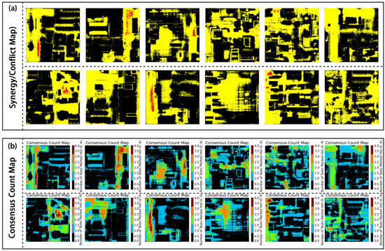 Methodologically and practically, this study delineates clear applicability bounds and usage guidance. The proposed evaluation toolkit serves as a general baseline for “learning in lieu of simulation.” For conceptual and early design stages, SolarH and Rad surrogates are well suited for rapid iteration, enabling designers to screen alternative block layouts, corridor orientations, and courtyard configurations with second-level feedback on solar access and long-term irradiation potential. UTCI surrogates can be used as an intermediate filter to flag areas of potential thermal stress, but final comfort assessment should be complemented by full atmospheric and microclimatic frameworks, especially in critical seasons. Wind surrogates are most appropriate as qualitative or pre-screening tools to highlight ventilation corridors and potential risk zones, and should be paired with physics consistency constraints or hybrid paradigms (e.g., GAN+CFD/PINN) to avoid critical errors in sensitive areas such as plazas, schoolyards, or pedestrian canyons. Cross-task synergy/conflict maps and consensus counts can directly support multi-objective trade-offs and sensitivity analysis by identifying where multiple targets agree or conflict spatially.