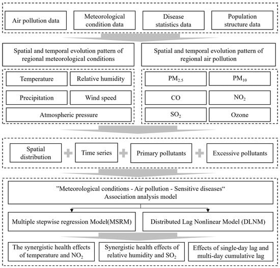 Global climate and environmental changes have several impacts on human health, such as an increase in the probability of related diseases and deaths [1,2,3]. The Fourth and Fifth Assessment Reports of the Intergovernmental Panel on Climate Change (IPCC) also clearly indicate that global climate change will continue to have direct or indirect impacts on human health [4,5]. With the development of urbanization and industrialization, urban air pollution represented by haze has intensified, which can easily lead to respiratory and circulatory system diseases, seriously affecting people’s normal lives [6]. There are studies showing that nearly three million people worldwide die directly or indirectly from outdoor air pollution injuries annually, especially in China, where air pollution is severe, with pollutants such as PM2.5 exceeding the standard [7,8,9] and affecting a wider range of people. Therefore, a systematic analysis of the synergistic mechanism between climate conditions and air pollution on the sensitive disease processes of urban residents has important practical significance [10].
