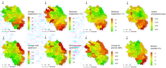 Figure 3 shows the annual spatial distribution of meteorological elements in various cities within the Yangtze River Delta region. Overall, the average annual temperature range in the Yangtze River Delta region is between 15.3 °C and 18.4 °C, with a relative humidity of about 77% and an average wind speed of 2.4 m/s. The average annual precipitation in the region ranges from 1150 millimetres to 1750 millimetres, with a decreasing trend from south to north. The average annual precipitation in Zhejiang Province in the south is 1600 millimetres, while it is 1200 millimetres in Jiangsu Province in the north. The southern region of Zhejiang Province has the highest annual precipitation, about 1750 millimetres, while the areas with the lowest precipitation are Suqian and Huainan in central Jiangsu Province, about 1100 millimetres. In addition, Wenzhou City has the highest average annual temperature of about 18.4 °C, while the neighbouring Lishui City has the lowest average annual temperature of 15.1 °C. The spatial distribution characteristics of the highest and lowest annual temperatures in other cities are basically consistent with the characteristics of the average temperature, and there is little difference within the region. Meanwhile, due to the highest average altitude and lowest average air pressure in the region, Wenzhou has the highest average relative humidity and corresponding annual precipitation. Except for cities along the eastern coast such as Lianyungang, Yancheng and Nantong, the wind speed in other areas is relatively similar.