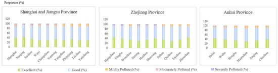 The proportion of days with excellent air quality ratings in Jiangsu Province range from 72.6% to 89.2%. Among them, Suzhou and Huai’an have the least and most excellent days, respectively. The proportion of moderate and above pollution days range from 1.3% to 5.2%, with Suzhou having the highest proportion and Huai’an having the lowest proportion of pollution days. The proportion of days rated as excellent air quality in Zhejiang Province range from 81.6% to 91.2%, with Hangzhou having the lowest proportion and Quzhou having the highest proportion. The proportion of moderate and above pollution days range from 0.9% to 4.3%. Quzhou City has the lowest proportion of pollution days and the best air quality in the province, while Hangzhou City has the highest proportion and a more severe pollution situation than other cities. In Anhui Province, the proportion of days with good urban air quality is on the rise, ranging from 81.6% to 98.3%. Hefei City has the least number of days with good air quality, while Anqing City has the greatest number of days with good air quality. The proportion of moderate and above pollution days ranges from 0.2% to 8.1%, with Anqing City having the lowest proportion of pollution days. Hefei has the highest proportion of pollution days and the worst air quality in the province.