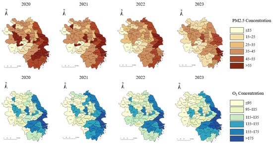 Spatial distribution pattern of PM2.5 and ozone concentrations in the Yangtze River Delta region from 2018 to 2024.