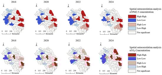 Local spatial auto-correlation analysis of PM2.5 and ozone concentrations in the Yangtze River Delta region from 2018 to 2024.
