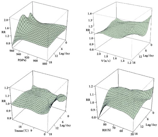 RR surface distribution of lagged effects of meteorological factors on respiratory diseases in the Yangtze River Delta region from 2018 to 2024.