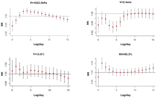 Based on the above analysis, we chose to observe the extreme values of various factors at the 98% percentile, namely air pressure at 1022.5 hPa, wind speed at 2.4 m/s, temperature at 13.9 °C and relative humidity at 65.2%, to explore the impact characteristics of various meteorological factors on respiratory diseases under extreme conditions. As shown in Figure 8, high pressure mainly has a significant inducing effect on respiratory diseases at a lag of 4 days, and the highest risk occurs at a lag of 6 days, with a significant cumulative lag effect. When the wind speed is 2.4 m/s, its impact on diseases is not significant, but in lower wind speed environments (i.e., less than 0.7 m/s), it has a significant impact on respiratory system diseases. Appropriate wind speed is beneficial for reducing pollutant concentration and has an inhibitory effect on respiratory diseases. The lag effect of relative humidity shows a ‘V-shaped’ change over time, and as the lag time increases, the cumulative disease effect becomes more pronounced. Low-humidity weather has a significant lag effect on respiratory diseases in the Yangtze River Delta region. Studies have shown that in high-humidity environments, the reproductive function of viruses or bacteria is continuously enhanced, which has a significant inducing effect on respiratory diseases [49,50].