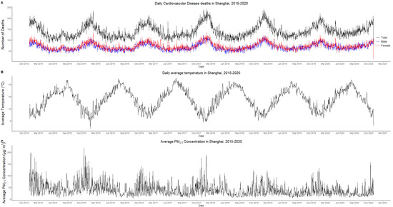 Time series plot of daily CVD mortality and changes in temperature and humidity in Shanghai from 2015 to 2020. (A) Daily CVD deaths in Shanghai, 2015–2020; (B) Daily average temperature in Shanghai, 2015–2020; (C) Daily average PM2.5 concentrations in Shanghai, 2015–2020.
