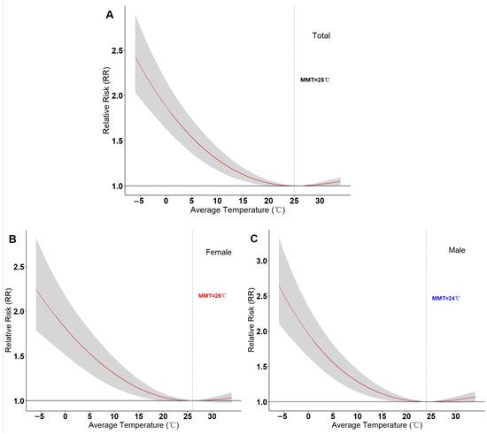 Association curve between daily average temperature and CVD deaths in Shanghai, 2015–2020. (A) Total CVD deaths; (B) CVD deaths in females; (C) CVD deaths in males. The grey shaded area represents the 95% confidence interval (95% CI) of the relative risk (RR) values.
