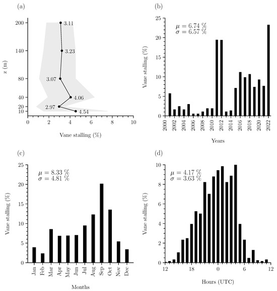 Figure 3c shows the average relative wind vane stalling occurrence at 10 m for each month. Two distinct periods with increased wind vane stalling emerge: spring months to early summer (March–July), and even more during the late summer to early autumn (August–October). We observe that wind vane stalling is more likely during these periods, peaking significantly during September (