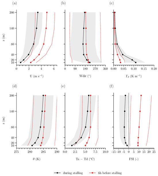 ), and Fog Stability Index (FSI). The black line indicates the average vertical profile when the stalling event occurs at 10 m, and the red line represents the average profile six hours prior to the stalling event. The average wind speed profile (