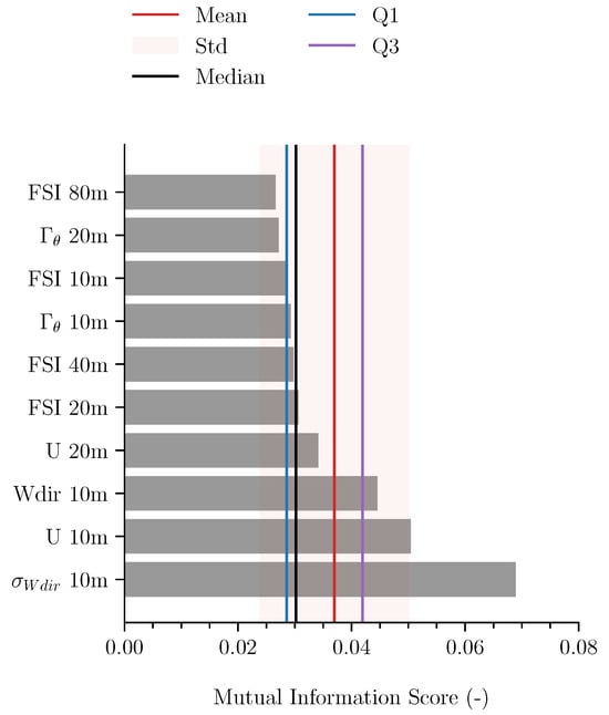 Figure 5 shows the ten highest-ranked features based on their MI-score alongside the mean, median, standard deviation, and inter-quartile range of the MI-score of all evaluated features. As expected, the variation in wind direction (standard deviation: