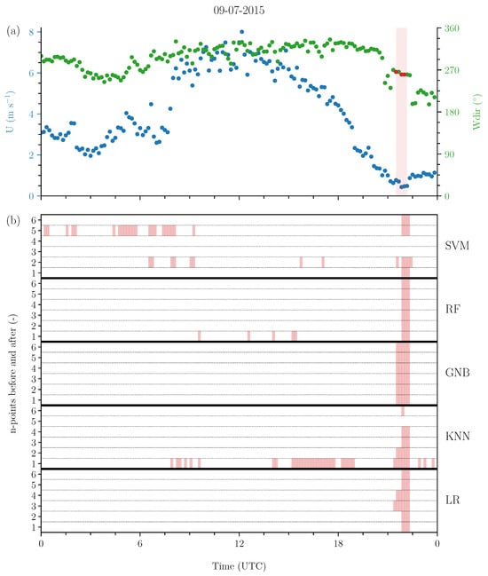 Figure 6 displays a time series of wind speed and direction alongside the output from the machine-learning methods on 9 July, 2015. The figure also showcases our approach to incrementally balance the dataset where different time windows influence the results. This example utilises a typical 80/20 division of training and test data (80% training data, 20% test data) across all machine-learning methods with the best configured parameter combinations.