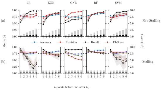 Figure 7a) significantly improve, approaching a value of 1, when more non-stalling points are included for training. In contrast, as more non-stalling events are retained, the performance metrics for identifying stalling events (