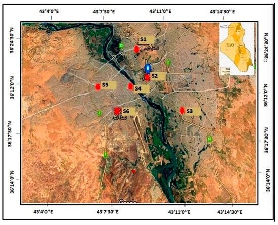 The study includes six monitoring sites in Mosul City, as shown in Table 2 and Figure 1. Three sites were chosen on the left bank of the city and three sites on the right side of the city. Sites S2 and S4 were directly located within the conflict zone (S4) or close to it (S2). Besides spatial extension of the conflict zone, data availability at previous sites was taken into account for the selection of present sites.