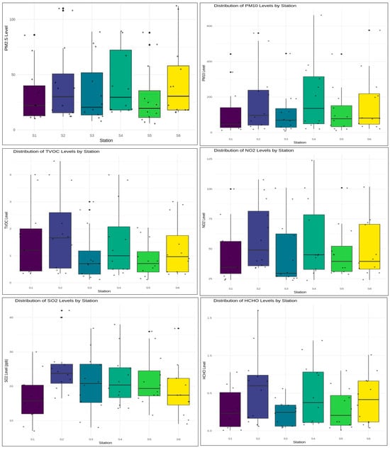 Only portable measuring devices were used for the on-site determination of the air quality parameters; in detail, a Dräger X-am 8000 for the measurement of NO2 and SO2, an AQI AX-8016 multifunctional air detector for PM2.5, PM10, formaldehyde and TVOC, as well as a GT8907 mobile weather station with an anemometer and data logger (Shenzhen Jumaoyuan Science and Technology Co., Ltd., Shenzhen, China), and the BENETCH software, version 3.4.0.3, for reading out the measurement data on a PC to determine the meteorological parameters of wind speed, wind direction, temperature and humidity. All equipment was freshly calibrated in the fab before the measurement campaigns, and signal output was cross-checked with common lab devices. The measurement data at all locations were recorded at 10-min intervals, with three individual data sets being summarized as half-hourly averages, i.e., 9 data sets per site and test day. The measurements took place over 8 h (10 a.m.–6 p.m.) between January and December 2022, with three test days per month being carried out as only daytime measurements. In total, 324 data sets per site were collected.