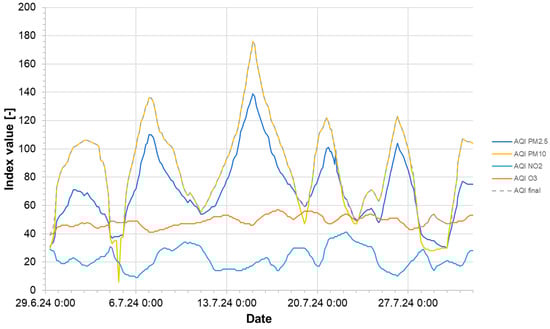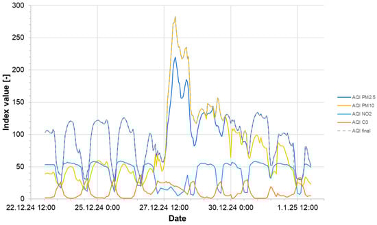 The air quality was assessed according to the US EPA’s AQI. This is a six-graded scale to categorise air quality from Good to Dangerous and where each air pollutant is assigned a conversion factor according to its human toxicity. Hence, conversion of concentration levels to AQI values is possible (µg/m3 for PM2.5 and PM10, ppm for CO and ppb for O3, NO2 and SO2). The final index value results from the respective maximum value of these six individual parameters. The calculation is carried out according to the following formula, with the breakpoints according to []: