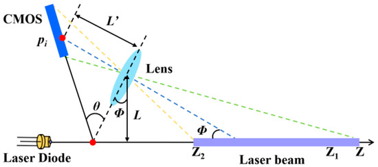 where θ is the inclination of the image plane relative to the imaging lens; Φ is the swing angle of the receiving telescope; L′ is the distance between lens and image plane; L is the distance between the receiving lens and the light source system; and pi indicates the signal intensity corresponding to each pixel of the image sensor, as shown in Figure 1.