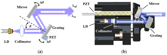 We adopted the Littrow configuration to maximize output power. The LD’s beam, after collimation, generates the first-order and the zeroth-order diffracted light at the grating. The first-order light is fed back into the laser diode, while the zeroth-order light exits as the output beam through a parallel-emitted reflecting mirror. A critical feature of our design is the co-mounting of the reflecting mirror and grating on a single bracket. Actuated by a piezoelectric transducer (PZT), the grating’s deflection is mirrored by the reflecting mirror, ensuring the output beam’s parallelism [42].