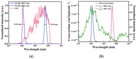(a) Spectrum comparison between linewidths of the LD and ECDL; (b) comparison of the NO2 absorption spectrum and switching wavelengths of the ECDL.