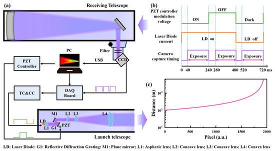 (a) Schematic of the ECDL-DIAL based on the Scheimpflug principle; (b) time sequences of the PZT controller, the laser diode, and the camera exposure; (c) the pixel–distance relationship.