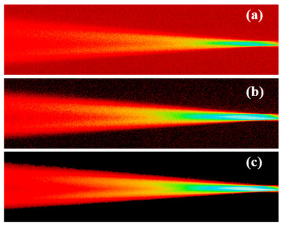 To eliminate the background noise, the raw image is subtracted from the captured image obtained when the laser is turned off. Although some isolated noisy pixels remain, the overall noise level is significantly reduced. Therefore, a median filter is applied to further suppress the noise in the image, yielding the results displayed in Figure 5b. Finally, as shown in Figure 5c, by employing a method of image beam path extraction, only the signals within the beam shapes are extracted. As a result, the image is left with minimal background noise and system noise, which is embedded within the beam path. It is important to note that noise from background signals and image sensors cannot be completely subtracted, necessitating further signal processing for accurate measurements.