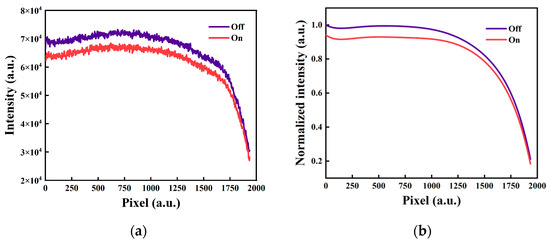 By summing the pixel intensities of Figure 5c along the longitudinal direction, the overall echo signal recorded by CCD is presented in Figure 6. Due to the continuity of atmospheric component distribution, a Savitzky–Golay filter is applied to smooth the curve [43]. The result of the algorithm processing and normalization is shown in Figure 6b. Due to the absorption of atmospheric nitrogen dioxide, the signal at on-wavelength is obviously weaker than that at off-wavelength.