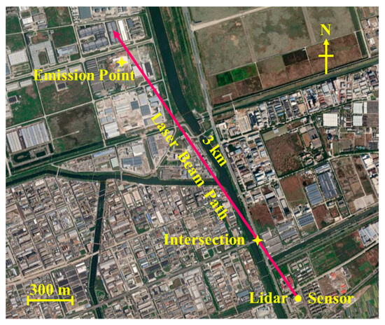 From 1 October to 2 October 2023, the weather was characterized by cloudy conditions and a northeasterly wind blowing at 4 m/s. An experiment was conducted to measure NO2 at the Shangyu Industrial Park in Shaoxing City, Zhejiang Province, to verify the feasibility of the NO2 ECDL-DIAL system. As shown in Figure 8, during the observation, the lidar maintained a fixed detection path, with the laser beam emitted nearly horizontally. The camera’s exposure time was set to 200 ms with an analog gain of 2, which is equivalent to approximately 2 min of single DIAL measurement for each profiling. In this experiment, considering the vast amount of image data accumulated from long-term monitoring, we adjusted the time resolution to once every 10 min to reduce the total volume of data processing. To further enhance the system’s time resolution, it is possible to consider upgrading the performance and storage capacity of the microcomputer. By doing so, the system’s data processing capability and efficiency will be significantly improved. The detection period was extended from 20:00 to 05:00 CST (China standard time zone).