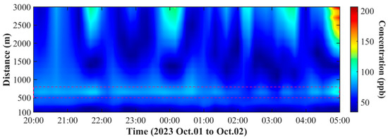 Figure 9 presents the continuous monitoring data spanning from 20:00 to 05:00. In order to obtain a more appropriate distance resolution of less than 50 m, the analysis was confined to data collected within a 3 km range for this specific test. The spatial and temporal distribution map of NO2 effectively reveals the concentration changes. A traffic intersection exists at a location 650 m from the detection path. As the area is an industrial park, large trucks often pass through this intersection, resulting in relatively high NO2 concentrations at this location. As indicated by the dashed line in Figure 9, NO2 concentrations typically ranged around 80 ppb from 20:00 to 1:00. From 1:00 to 4:00, the concentration decreased, but after 4:00, it increased again, most likely due to the evolution of the diurnal planetary boundary layer. The spatial and temporal patterns of NO2 concentrations illustrate the dynamics of pollutant dispersion, exhibiting a marked occurrence of concentration peaks between 2000 and 3000 m. This range is characterized by the detection of several high-concentration maxima, which are presumably linked to the emission activities of the nearby industrial park within the designated proximity.