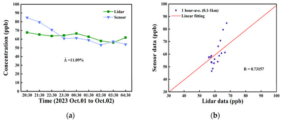 The mean relative bias of lidar measurements from 1 to 2 October 2023 was found to be approximately 11.09%, as illustrated in Figure 10a. A Pearson correlation coefficient of 0.73157 was calculated using continuous measurements over the two days, indicating a relatively high correlation between the two datasets, as shown in Figure 10b. Table 2 presents the relative bias between the lidar measurements and the sensor concentration. At 20:30, industrial activities, including transportation and factory operations, remain relatively active. Due to the distance between the lidar’s detection path and the point-based sensor, the uneven distribution of atmospheric pollutants, combined with the time required for transmission and diffusion, leads to a delay in the data. In contrast, by 3:00 a.m., industrial activities have essentially ceased, and pollutant diffusion has stabilized, resulting in a more uniform distribution of pollutants in the atmosphere. This makes the data from both sources more consistent.