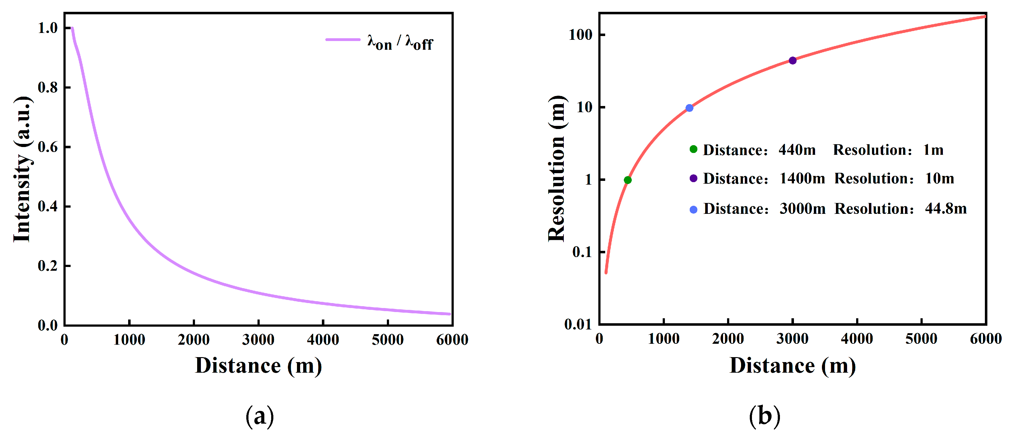 The differential signal is obtained by comparing the echo signal of the λon to the echo signal of the λoff and combining it with the pixel–distance relationship. This signal attenuates with distance due to atmospheric absorption and scattering. The DIAL ratio curve is constructed from the division of the λon lidar signal by the λoff lidar signal, as depicted in Figure 7a. Figure 7b illustrates that the lidar system can achieve high precision of cm-level distance resolution for short-range detection. However, the resolution performance degrades as the detection range increases: at 440 m, the distance resolution is 1 m; at 1400 m, it decreases to 10 m; and at a detection range of 3 km, the resolution further drops to 44.8 m. Beyond this range, the distance resolution rapidly deteriorates, reaching nearly 200 m when the detection range extends to 6 km. The reliability of far-range lidar signals may be compromised in the presence of atmospheric turbulence or localized aerosol concentrations, due to this degradation of range resolution. Consequently, the maximum measurement distance is generally limited to 3 km.