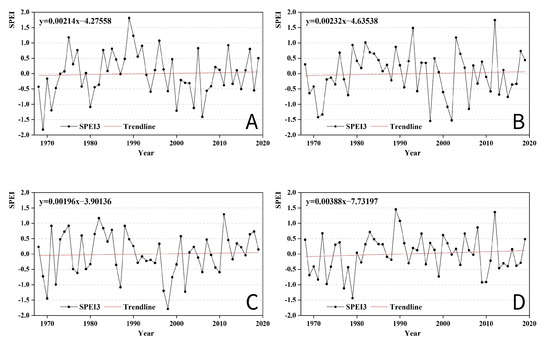 SPEI12 had a general upward trend between 1968 and 2019, increasing at a rate of 0.00362 per year (Figure 3). This trend may be related to climate change, shifts in precipitation patterns, and variations in potential evapotranspiration.