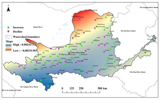 Sen’s Slope estimator and TFPW-MK test results for the Yellow River Basin from 1968 to 2019.