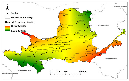 Drought frequency distribution map for the Yellow River Basin from 1968 to 2019.