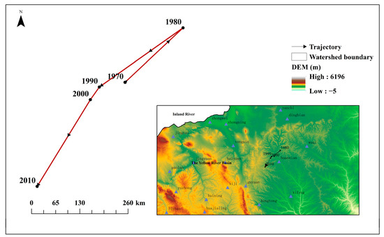 The SPEI values for the years 1970, 1980, 1990, 2000, and 2010 were systematically calculated using the centroid migration model in order to provide a thorough examination of the spatial variation features of drought occurrences in the basin. By applying the centroid migration model, the centroid positions of drought events can be determined, and connecting these centroids chronologically produces a centroid migration trajectory map. As shown in Figure 6, this map visually presents the geographic distribution of drought cases and their long-term trends in the Yellow River Basin.