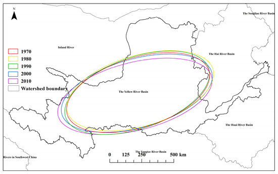 The standard deviation ellipse diagrams for the years 1970, 1980, 1990, 2000, and 2010 are presented in this work in order to better investigate the distribution features, geographical clustering, and changes in spatial centroid and direction of drought emergence in this basin (Figure 8).