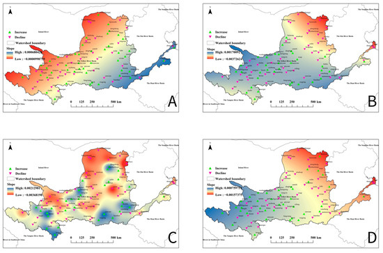 Seasonal Sen’s Slope estimator and TFPW-MK test results for the Yellow River Basin from 1968 to 2019. (A) Spring, (B) summer, (C) autumn, and (D) winter.