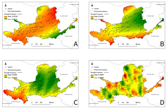 Seasonal drought frequency distribution map from 1968 to 2019. (A) Spring, (B) summer, (C) autumn, and (D) winter.