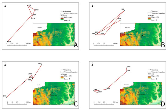 From 1970 to 2010, the centroid of drought events in the basin was primarily concentrated in the central region of the basin (Figure 7). However, over time, the centroid demonstrated a continuous migration pattern rather than remaining stationary. This migration was influenced by various factors, including climatic changes, human activities, and hydrological cycle variations.