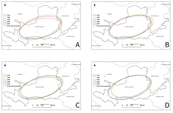 Standard deviation ellipse for each season from 1970 to 2010. (A) Spring, (B) summer, (C) autumn, and (D) winter.