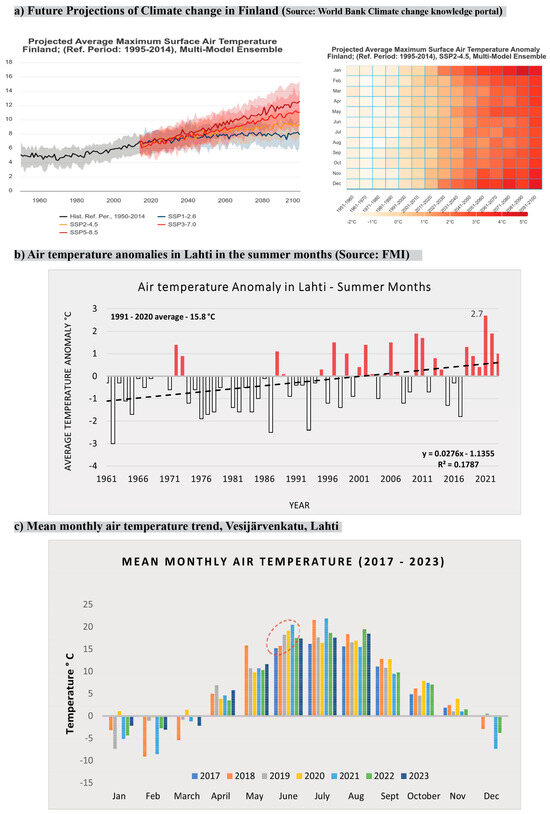 The city of Lahti is already witnessing substantial increases in air temperature, reflective of larger climate trends observed across Finland. According to the World Bank’s Climate Change Knowledge Portal, Finland’s climate has shown a steady warming trend, which is corroborated by Finnish Meteorological Institute (FMI) data on temperature anomalies. Lahti, in particular, recorded summer temperature anomalies reaching up to 2.7 °C above the 1991–2020 baseline, with extreme anomalies observed in June, peaking at 5 °C in 2021.