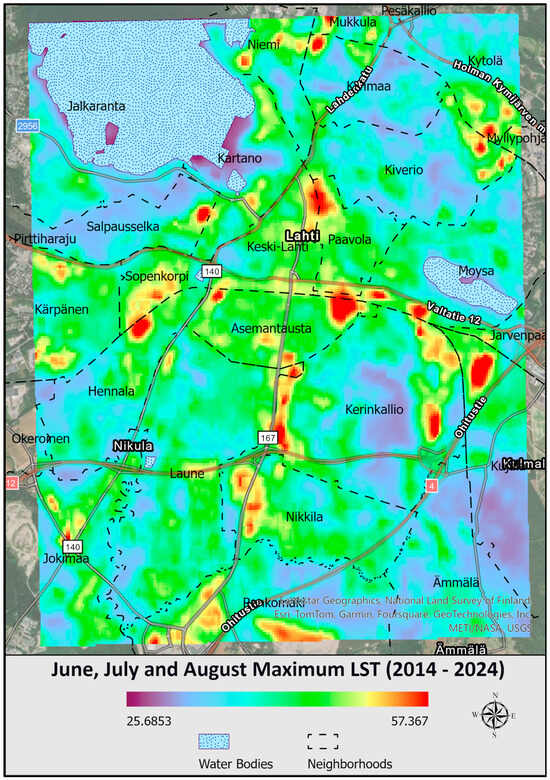 Satellite-based analysis of Land Surface Temperature (LST) highlights considerable variability across Lahti’s land cover types. Data collected from 2014 to 2024 reveal that LST can vary up to 22 °C across land use and land cover (LULC) types in Lahti, with the urban core showing significantly higher temperatures than surrounding green or water-covered areas.