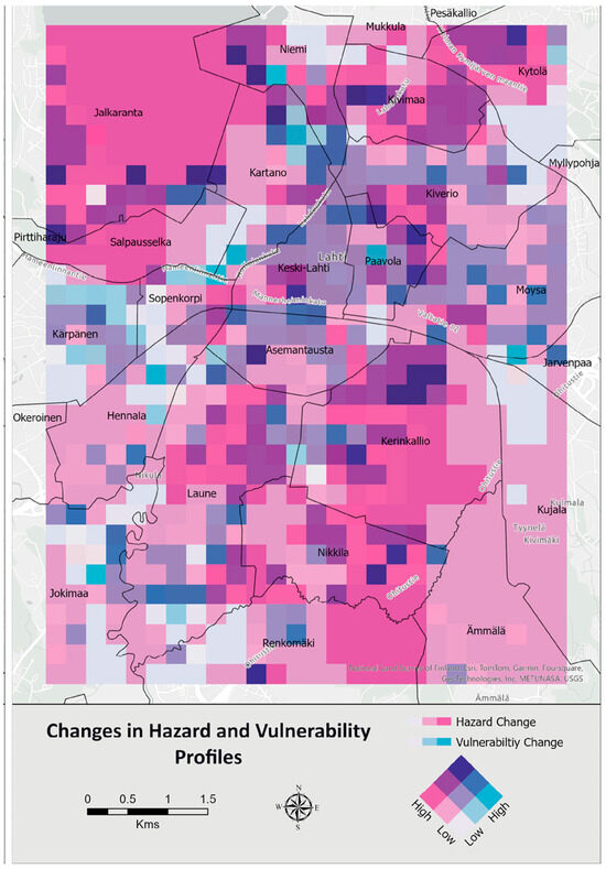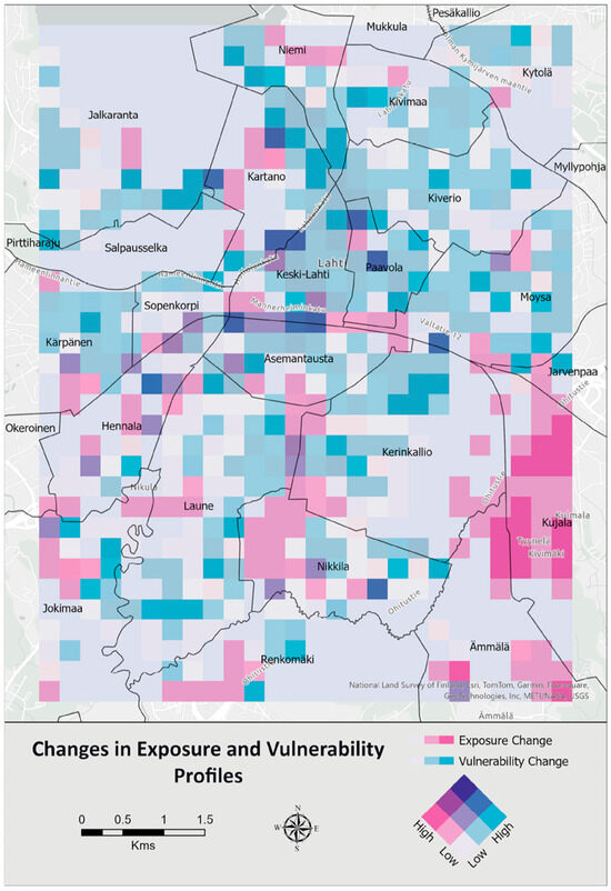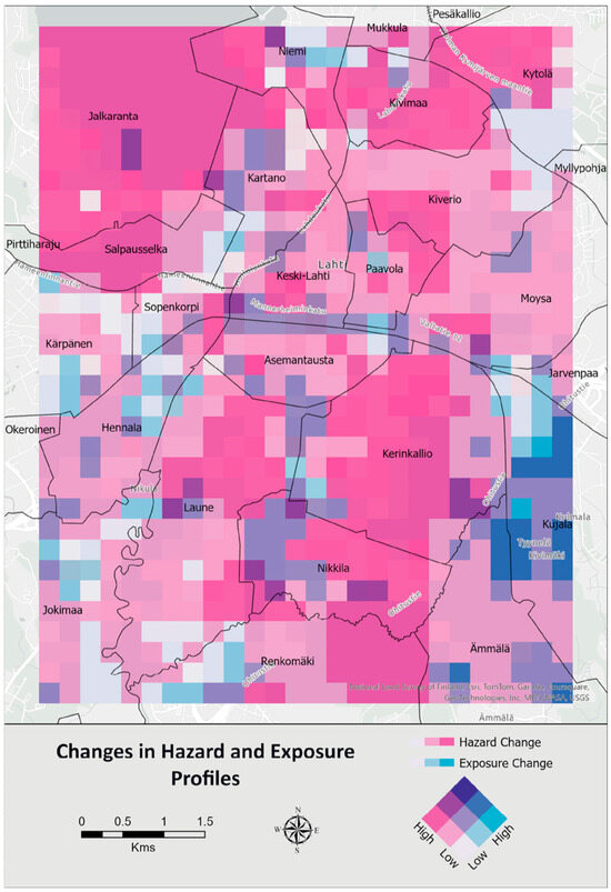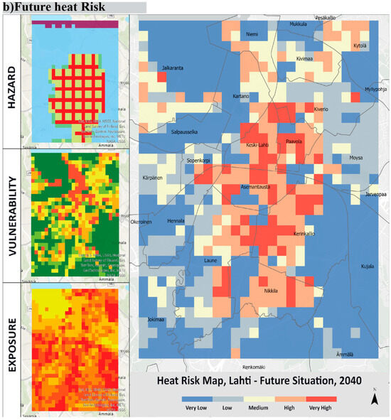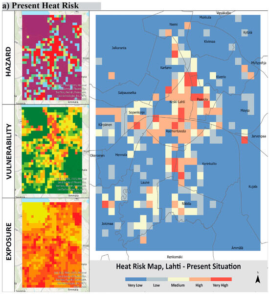 33] which defines risk as a function of hazard, vulnerability, and exposure. This study leverages spatial mapping and data analysis techniques to visualize at-risk areas as a product of the hazard, vulnerability, and exposure components of risk, providing critical insights for planners in the city of Lahti and potentially serving as a model for other areas in Finland. Heat risk has been mapped for heatwave days (i.e., very hot days defined by FMI as the maximum daily temperature above 30 °C and mean temperature above 24 °C) to identify extreme heat risk in the present and future scenario and understand what the future will look like.