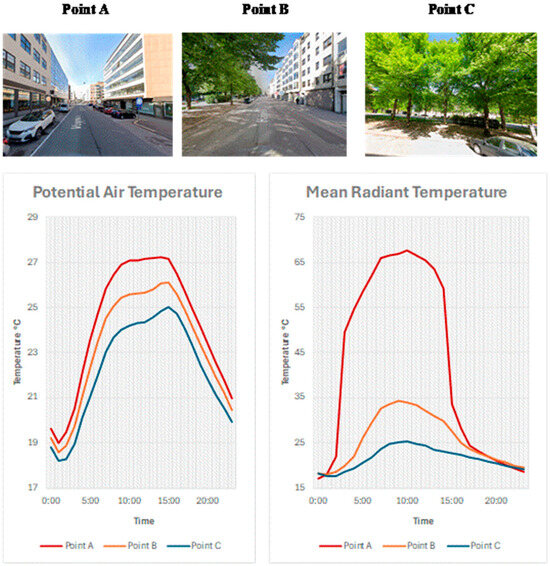 Scenario 1: Modeled for a maximum air temperature of 30.4 °C, representing a hot day in June 2024. The simulation ran for 24 h, allowing for a detailed analysis of diurnal temperature variation.