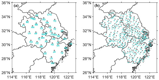 Distribution map of meteorological stations in (a) 41 cities and (b) 241 regions within the YRD region.