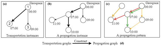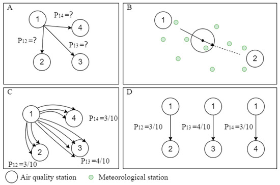 The average transport time was averaged to generate the final results. Figure 2C,D provide an example of calculating transport probability by sampling air packets, from which the transport trajectory for each pollution event is derived (Figure 3d). Each transport trajectory comprises two nodes, representing positions i and j, connected by a directional edge indicating the transport direction. In this framework, each node n includes additional parameters: the timestamp n.t and the observed pollution concentration n.c. at time n.t. Furthermore, additional information is computed along each directional edge : (a) the transport duration for each instance is denoted by tt; (b) p is the estimated transport probability, indicating the contribution factor, or the proportion of pollutants transported from the origin to the destination; (c) thus, we can calculate the quantity of transported pollutants as ; (d) finally, we define an impact factor a = , which represents the ratio of pollutants received at the endpoint relative to those originating from the start point. If comprehensive testing results indicate , pollutant transportation is deemed negligible.