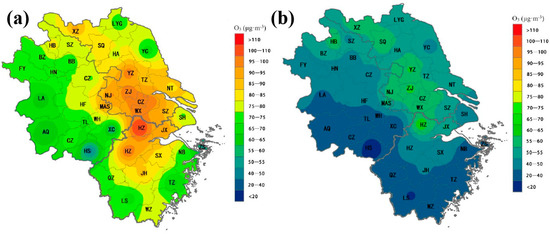 (a) Regional background concentration of O3 and (b) spatial distribution of O3 generation in the YRD region from May to September, as determined using the TCEQ method.