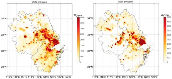 Daily estimations of locally generated ozone concentrations were derived from the difference between DMA8–O3 readings and regional background levels recorded at each monitoring station. During the period from May through September, the average generated O3 concentration in the YRD was approximately 44.9 μg·m−3, with local contributions accounting for about 36.3% of the total ozone levels (encompassing both regional background and locally generated components). Figure 4b illustrates the spatial distribution of locally generated O3 across the region, showing significant O3 generation in parts of Jiangsu Province, as well as Northern Anhui and Northern Zhejiang. These high ozone areas also have higher volatile organic compounds (VOCs) and NOx emissions from industrial activities, but whether there is a correlation between these two factors remains to be studied (see Figure 5). Additionally, geographical factors play a role; inland cities distant from coastal regions show enhanced ozone generation potential due to favorable conditions for ozone formation.